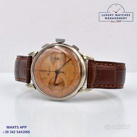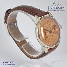 Minerva Cronografo oversize acciaio, anno di produzione 1941 circa, ghiera acciaio liscia, vetro plastica bombato, quadrante tropicale bicolore bronzo con indici arabi, due contatori orizzontali, scala telemetrica medicale, movimento meccanico a carica manuale, cinturino generico in pelle di vitello colore marrone con fibbia acciaio.