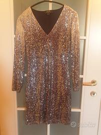 Abito corto da sera grigio in paillettes di grande effetto.