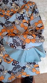 Fantasia primaverile su fondo azzurro, ha maniche rovestite con volant al fondo.
