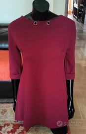 Mini abito made in Italy del brand Blue Sand di un bel colore rubino/ bordeaux. Girocollo ,maniche 3/4 .Retro dell'abito più lungo,ambato, tipo redingote. Dimensioni : 40 cm larghezza spalle ,64 cm lunghezza totale. Due piccoli oblò metallici sotto il collo a cui è possibile agganciare una qualsiasi collana o comunque belli anche senza agganciare nulla.Ottime condizioni ,indossato poco. Possibile consegna a mano ad Arcore,Monza,Sesto San Giovanni e a Milano