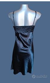 Elegante mini abito o sottoveste in raso nero lucido. Presenta un seducente corpetto con paillettes nere scintillanti e spalline regolabili. La schiena ha un dettaglio arricciato per una vestibilità perfetta. Ideale per serate speciali, come lingerie di lusso o per un look glamour. Buone condizioni.Tg42 Elastane/poliestere/raso