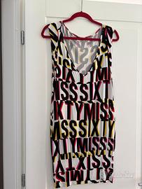 Questo abito, della celebre linea Miss Sixty, presenta un design aderente che valorizza la figura. La stampa grafica con le scritte "MISS SIXTY" in nero, giallo e rosa su sfondo bianco lo rende un capo unico e super alla moda, perfetto per chi ama distinguersi.