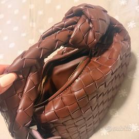 Realizzata in pelle PU intrecciata in stile Bottega, presenta l’iconico nodo e la chiusura con zip colori oro.