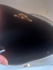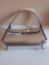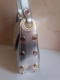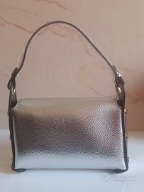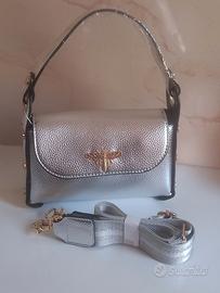 Mini bag con chiusura a forma di ape in ecopelle color argento. E nuova,completa del suo cartellino. Molto carina,perfetta da portare a mano e completa della sua tracolla regolabile. Misure: L cm 20 H cm 15 P cm 6. No spedizione, solo consegna a mano