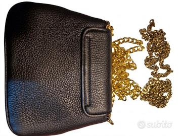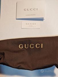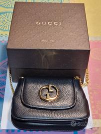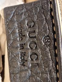 Vendo, per inutilizzo, mini borsa a tracolla Gucci originale. Il modello è caratterizzato dalla iconica pelle nera martellata di altissima qualità e dal distintivo logo GG in metallo dorato lucido sulla patta frontale, un richiamo diretto agli archivi storici della maison. È una borsa elegante, compatta e senza tempo, perfetta per il giorno e la sera. La borsa è in buone condizioni generali. È stata indossata con cura e presenta i normali e lievi segni d'uso sulla pelle e sulla metalleria, che non ne compromettono affatto la bellezza. Gli interni sono puliti. Dettagli specifici: - Marca: Gucci - Materiale: Pelle martellata nera - Dimensioni: lunghezza 17 cm; altezza 14 cm; profondità: 6 cm - Colore Metallo: Oro lucido - Tipo di tracolla: Doppia catena dorata - Finiture: Logo GG vintage frontale - Interno: Dotato di etichetta in pelle con numero di serie (vedi foto) e scritta "Gucci made in Italy". La borsa viene venduta completa di tutto il corredo originale mostrato nelle foto: - Scatola rigida Gucci "Firenze 1921" - Dustbag (sacchetto antipolvere) marrone originale - Cura del prodotto (libretto) - Controllato card