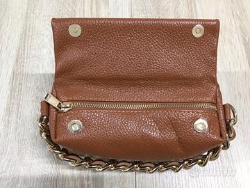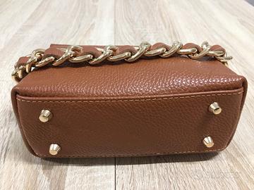 Mini borsa squadrata manico a catena con pelle intrecciata, color marrone in Vera pelle. Chiusura col clip magnetica e cerniera, fodera interna in tessuto con tasca interna a cerniera. Dimensioni Larghezza 22 cm, Altezza 12 cm, Profondità 9 cm. Per qualsiasi informazione contattatemi. Posso spedire