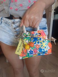Mini borsetta a mano o da cintura nuova mai usata con cartellino. È dotata di una catenella con moschettone per regolare il modo di appenderla alla cintura o al passante dei pantaloni. Ottima anche come idea regalo. Fantasia fiori multicolor. Cuoricino con strass sulla catenella