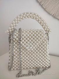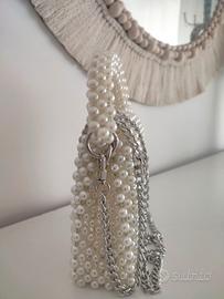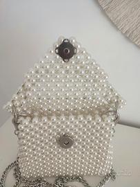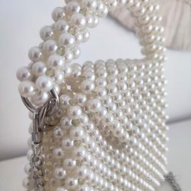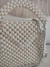 Mini borsa gioiello da sera o da cerimonia in perle. Fatta interamente a mano. Pratico manico in perle staccabile. Completa anche di tracolla argentata. Ideale per spose, cerimonie o serate. Chiusura con bottone magnetico argentato