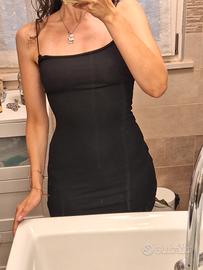 Abito corto in tessuto elastico, colore nero, taglia S / 40 IT, di Zara. Davanti internamente ha una fascia nera tono su tono con elastico sotto il seno per non dover indossare il reggiseno.