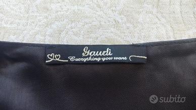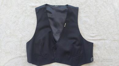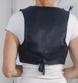 Originale mini gilet firmato Gaudì, in leggero gessato nero, con due finte taschine anteriori, con retro e martingala in tessuto lucido.