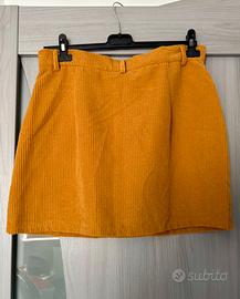 Gonna corta in velluto a coste forma ad A di color senape giallo ocra. - Tessuto morbido e confortevole. - Chiusura con zip e bottone frontale. - Tasche.