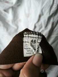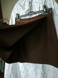 Minigonna marrone. Taglia 46, 100% poliestere. Vita 37, fianchi 50, lunghezza 44. Chiusura laterale con bottone e cerniera. A portafoglio ma ben sovrapposto, morbida e confortevole. Usata poco, ottime condizioni.