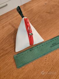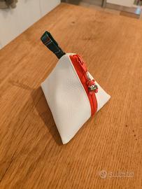 Pochettina triangolare in ecopelle bianca, interno scozzese, con decorazione a orsetto sul cursore della cerniera, dimensioni circa 11x11x11 cm, ideale per contenere piccoli oggetti o come porta monete