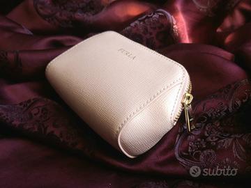 Piccola pochette/trousse in vera pelle, effetto saffiano rosa chiaro.