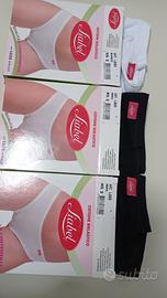 3 paia di mini slip in cotone bielastico della LIABEL, misura 3, di cui due in colore nero e una di colore bianco. Con logo Liabel in stoffa rossa sul fronte dello slip.