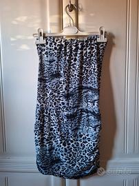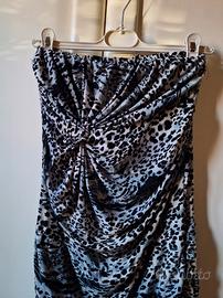 Bellissimo vestito corto a fascia (senza spalline) con fantasia animalier nei toni del grigio e nero. Stile: Modello aderente con particolare nodo drappeggiato sul davanti che valorizza le forme. Tessuto: Elasticizzato e molto comodo, resta bene in posizione. Look: Perfetto per una serata fuori o per l'estate. Stile anni 2000 (Y2K) #miniabito #fascia #animalier #grigio #y2k #party #tubino #drappeggiato #vinteditalia