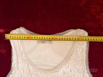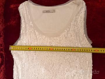 Miniabito con paillettes di colore bianco • senza maniche • scollo rotondo • bordini in chiffon di colore bianco intorno al giro manica e alla scollatura • l’abito è foderato in tessuto morbido nella parte anteriore, altezza seno e dietro altezza scapole • vestibilità classica • lunghezza mini