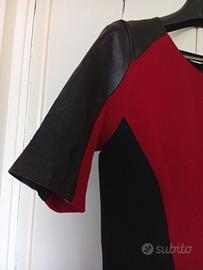 Miniabito sopra il ginocchio, rosso/nero, con disegno a clessidra, la parte in rosso è in tessuto elasticizzato, le maniche corte sono in pelle nera. Scollo rotondo, chiusura a cerniera sul retro. Molto femminile, misura dalla scollatura all'orlo 74 cm, in vita 32 cm., maniche lunghe 24 cm. Presenta una piccola scucitura all'orlo di una manica, poco visibile perchè all'interno. (vedere le ultime 2 foto)
