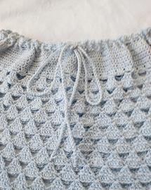 Minigonna copricostume fatta ad uncinetto in cotone celeste chiaro. Laccetto regolabile in vita. Il motivo a triangoli è elegante e raffinato. Taglia M, misure in foto.