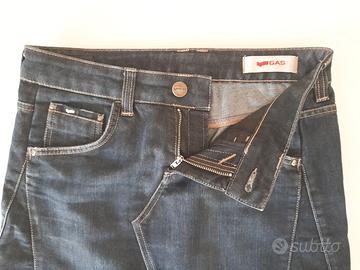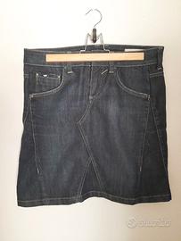 Vendo minigonna da donna - marca Gas – taglia waist 29 (che corrisponde alla taglia italiana 42-43 ***la misura in pollici 29 si riferisce al girovita ed equivale a circa 73-74 cm) – in cotone colore jeans – con cuciture in colore bronzo (come da foto) – con fascetta e passanti – con chiusura con zip e bottone – con due tasche anteriori e due tasche posteriori