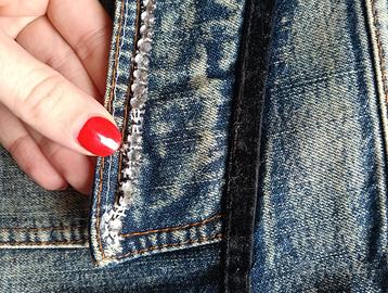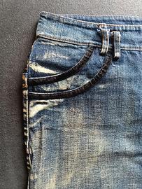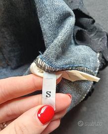 MiniGonna di jeans blu con gala nera donna taglia S made in Italy, cotone - gonna jeans - non elasticizzato, 100% cotone - nessuna marca - taglia s, veste una 42 circa Lunghezza 42 cm Vita 38 cm - made in Italy - ottime condizioni come da foto. Alcuni strass sulla tasca posteriore si sono staccati