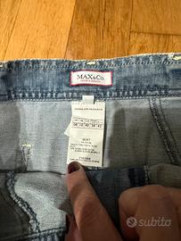 Bellissima minigonna Max&Co. in denim lavaggio medio, modello svasato, con orlo doppiato che dà ampiezza. Mai indossata. L’etichetta riporta taglia italiana 42, ma veste una taglia S.