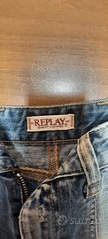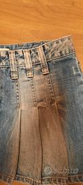 Minigonna jeans a pieghe Replay, lavaggio scolorito vintage. Bottone e lampo davanti,bottoni e tasche dietro. Taglia M
