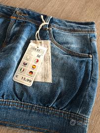 Gonna corta in jeans Terranova, taglia M, colore Blu denim medio, le tasche sono davanti e dietro, passanti in vita e chiusura con bottone e cerniera. Tutti i dettagli del modello e misure sono riportate in foto, acquistata e mai messa in uso, vendo per cambio taglia dopo la gravidanza, per ulteriori informazioni non esitate a contattarmi in chat.