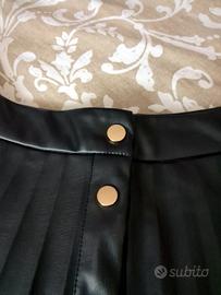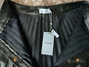 Gonna nera marchio Vila. Taglia L (EU 40). Modello a pieghe con bottoni dorati sul davanti, interno scamosciato elegante ma allo stesso tempo casual. Perfetta per look sia più formali che quotidiani. Mai indossata, condizioni perfette. Tessuto morbido e confortevole, ideale per ogni stagione. Spedizione veloce e imballo sicuro.