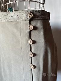 Minigonna vintage in pelle scamosciata, modello a portafoglio, svasata, color écru, con bordo in vita punzonato e bottoncini effetto legno. Senza fodera.