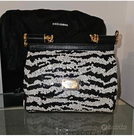 Miss Sicily,,l'intramontabile modello della borsa di Dolce & Gabbana...in versione Fashion,realizzata in cavallino e paillettes bianche e nere...a mano o a spalla con la sua bandiera in pelle nera....Ti aspetta per essere sfoggiata😉