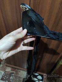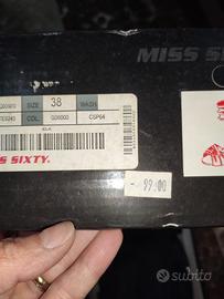 introvabili scarpe Miss Sixty con tacco alto e la particolarità che nel tacco c'è uno specchio che fa leggere il logo.Si allacciano con morbidi nastri con cui legarle alle caviglie con un fiocco