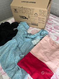 Mistery box, con vestiti da ragazza/donna, dal valore di 100 €, con all’interno circa 20 capi(estivi e invernali), tra questi un vestito Guess, un vestito Missguided e un vestito Please (in foto).