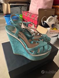 Vendo sandali zeppa 13 Miu Miu scamosciato senza scatola color azzurro in condizioni molto buone a 40 eu …taglia 38 ..originalissime ..vendo Sergio Rossi nuove usate una sola volta con scatola e sacchetto anti polvere bianche e nere 36,5 tacco 10 in stoffa a 50 euro ..originalissime solo persone serie grazie