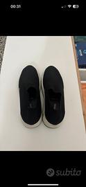 In tela elasticizzata nera con suola in gomma bianca.