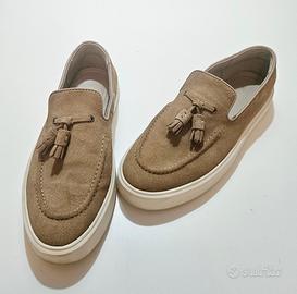 Scarpe-mocassini ZARA in pelle scamosciata di colore beige/cammello con nappine e suola in gomma bianca.