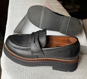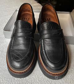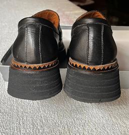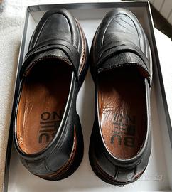 Vendo mocassini originali Bueno, modello "chunky" con suola platform, in vera pelle nera di altissima qualità. Le scarpe sono estremamente comode grazie alla morbidezza della pelle (caratteristica distintiva del brand) e alla fodera interna in cuoio. Il design è moderno e grintoso, arricchito dal dettaglio lavorato color cuoio lungo il bordo della suola. Marca: Bueno Materiale: Vera Pelle (interno ed esterno) Taglia: 36 Colore: Nero con finiture cuoio Stato: Buone condizioni generali. Segnalo, per massima trasparenza, dei leggeri graffi sulla punta della scarpa destra (come visibile nelle foto di dettaglio), che non pregiudicano l'estetica generale una volta indossate.