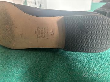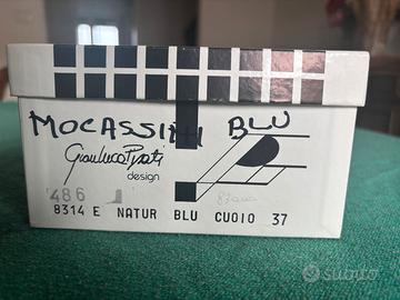 In morbida pelle di colore blu scuro, soletta interna in cuoio, suola esterna sempre in cuoio con tacco in gomma antiscivolo.