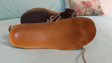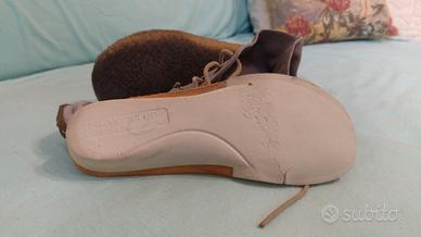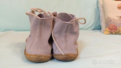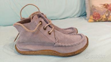 Scarpe stringate color grigio/carta da zucchero. Tomaia in camoscio, lacci in pelle beige, sottopiede in pelle. Soletta estraibile. Una via di mezzo tra un mocassino Hey Dude e un desert boot Clarks.
