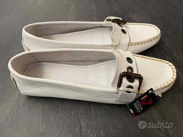 Comodi ed eleganti mocassini da donna in vera pelle bianco panna con cuciture a vista e fibbia decorativa NUOVI. Anche l'interno è tutto in pelle, mentre la suola è in gomma.