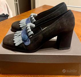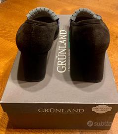 Vendo mocassini donna Grunland (portate solamente una volta per pochissimo tempo) in camoscio colore nero abbelliti da frangia grigia e fascetta con bottone avio; versatile e comodo con plantare confort RE-SOFT in morbida pelle, fodera interna e sottopiede sempre in pelle; tacco rivestito in camoscio altezza cm. 7