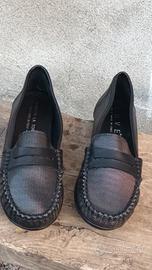 Mocassini in pelle goffrata colore nero effetto lucido, suola in gomma nera antiscivolo, numero 37, come in foto.