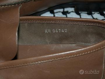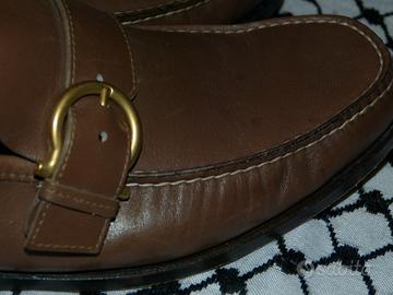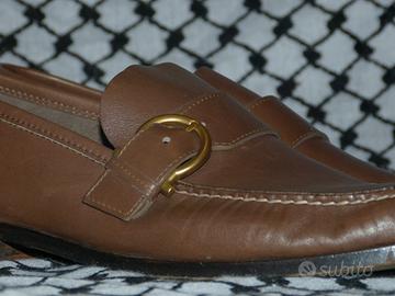 Italiano: Mocassini in pelle marrone scura di Salvatore Ferragamo eleganti, modello "Gancini".