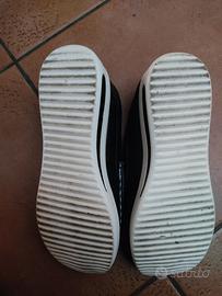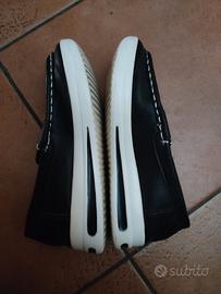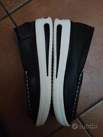 Vendo eleganti mocassini in ecopelle nera, arricchiti da una fibbia dorata a contrasto e cuciture bianche artigianali. La particolarità è la suola alta bianca che le rende incredibilmente ammortizzate e moderne, perfette per chi sta molto in piedi ma vuole un look curato. Dettagli: Fibbia a "H" color oro, suola sportiva con inserto nero. Condizioni: Eccellenti, usate pochissimo. La tomaia è perfetta. Sono un 37 di numero