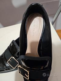 Mocassini neri in vernice di Zara Trafaluc, con punta arrotondata e cinghia dorata sul davanti. Con rialzo di pochi centimetri sul tallone. Numero 38.