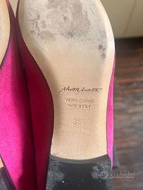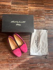 Bellissimi mocassini di alta qualità, made in Italy, pelle scamosciata rosa con profilo in velluto blu, taglia 36 1/2