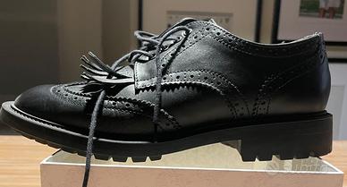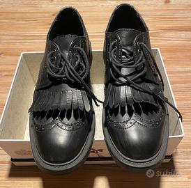 Mocassini stringati neri con frange e suola in vera gomma a carroarmato. Indossate una sola volta. Marca Boemos. Pelle sintetica.