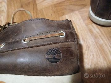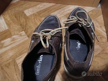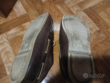 Mocassini da uomo originali Timberland, colore marrone, in cuoio con duola in gomma, taglia 44,5/45, logo laterale e sulla linguetta, in discrete condizioni.