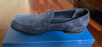 Vendo splendidi mocassini Franceschetti da uomo, realizzati interamente in morbido camoscio blu, con doppia fibbia laterale e suola in cuoio.