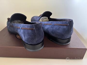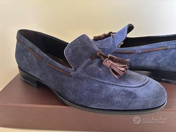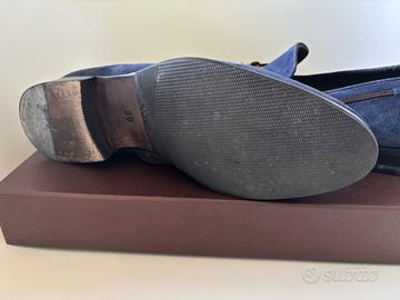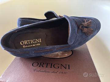 Mocassini prodotti da calzaturificio artigianale Ortigni, camoscio colore indaco con nappine marroni, come nuovi.